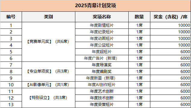 2025青幕打算从竞赛单位报名日期为2025年 8月26日-10月10日。2025搜狐青幕打算评审流程分为初审,复审,终审三个阶段,初审由影评人、影视自卑V构成评审团。复审、 终审由出名导演、影视行业资深从业人员构成的业界评审以及学术权势巨子人士及传授专家构成的学界评审,对做品进行严酷的遴选和打分,通过公允公开的评流程,卑沉每一位创做者的做品,激励青年导演们的正在短片的篇幅内摸索叙事的可能。